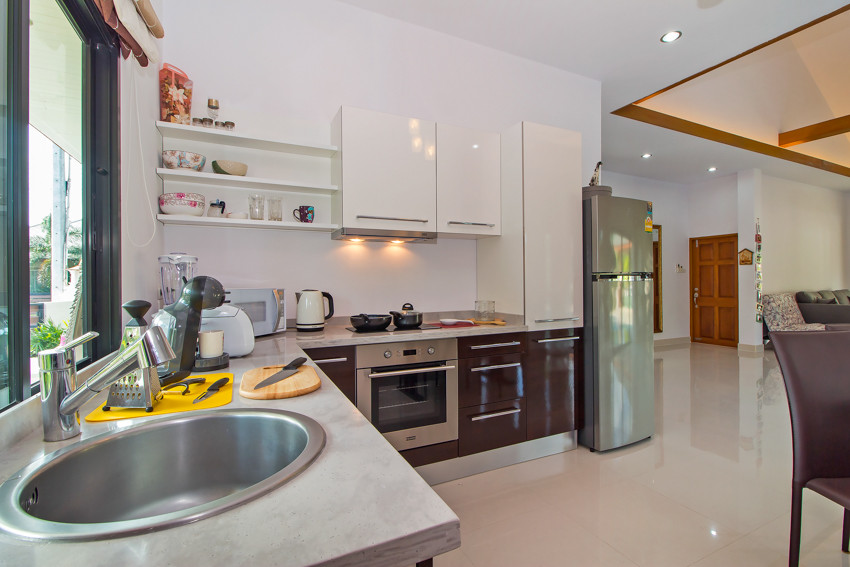 This three bedroom luxury villa’s best features are a gigantic swimming pool with night lights, a spacious terrace with a cozy relaxation zone and special BBQ area. Big tropical garden with exotic plants, a lawn in front of the swimming pool with sun loungers – what else would you need for a good rest?